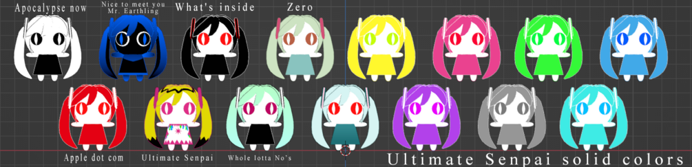 . Includes 15 different materials that change her aspect in reference to her appearance in varying music videos. (8 from different MVs and 7 solid colors from the Ultimate Senpai MV).