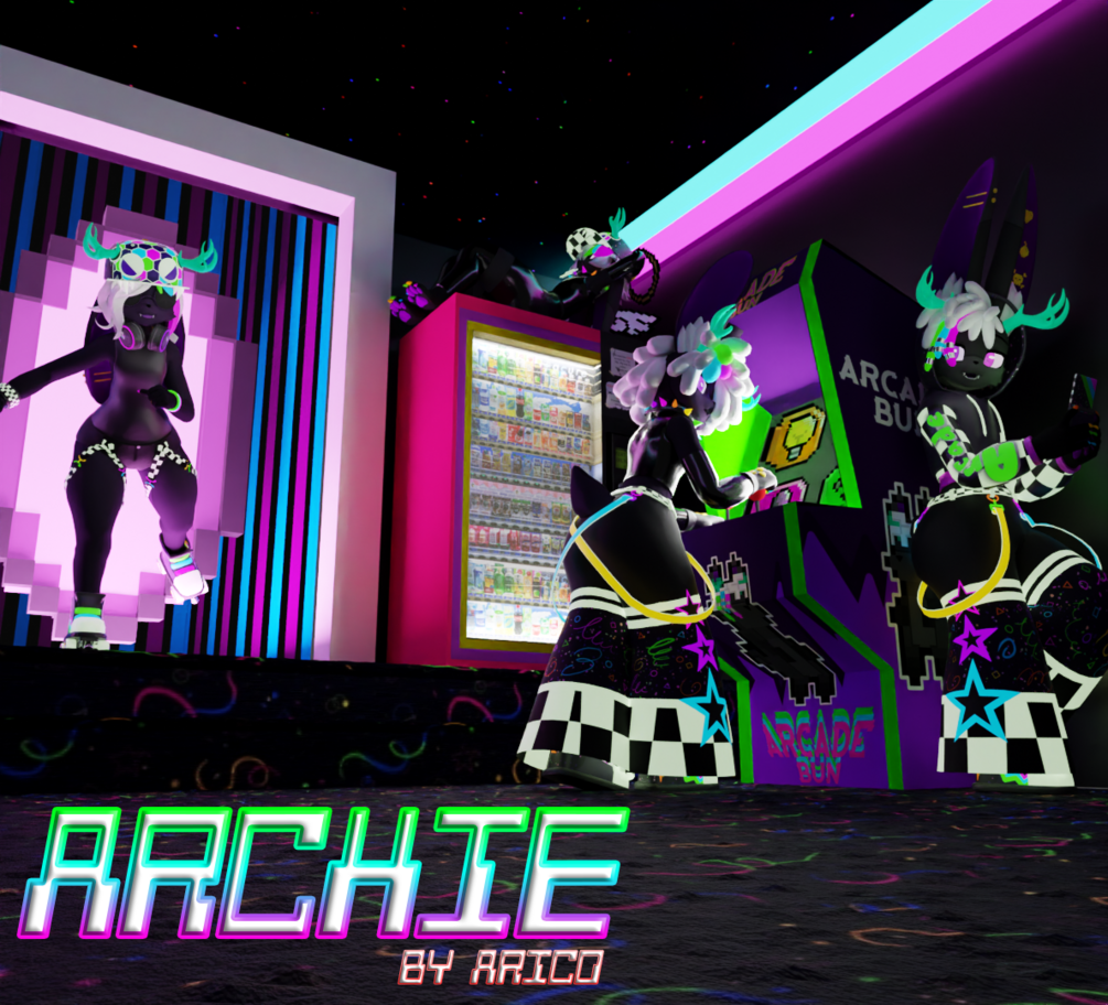 Archie the Arcade Bunny. A jackalope avatar made for VRChat that features a variety of clothing options and fun gimmicks; from a flowtoy inspired by DDR to a fully functional handheld console used for toggling other gimmicks.