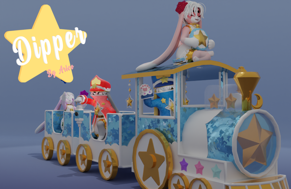Dipper the Dream Train Conductor. A bunny avatar made for Vrchat that features a wide range of props. From a lantern to light your way in dark maps, to a flying train that seats four.